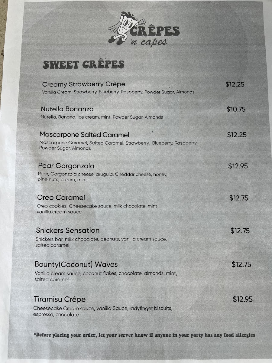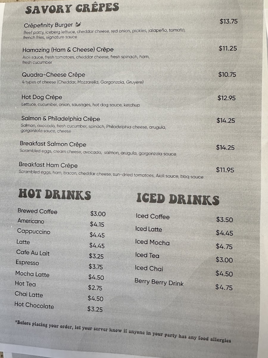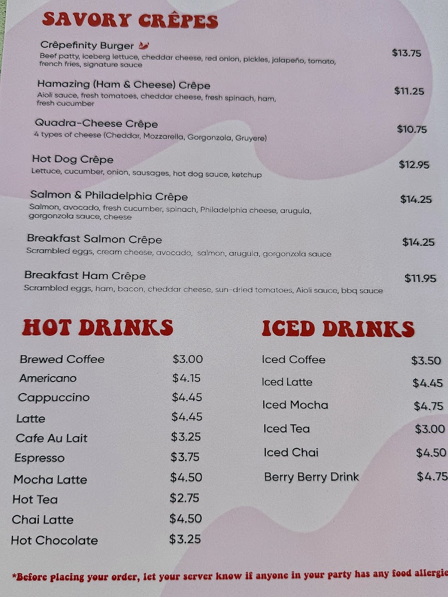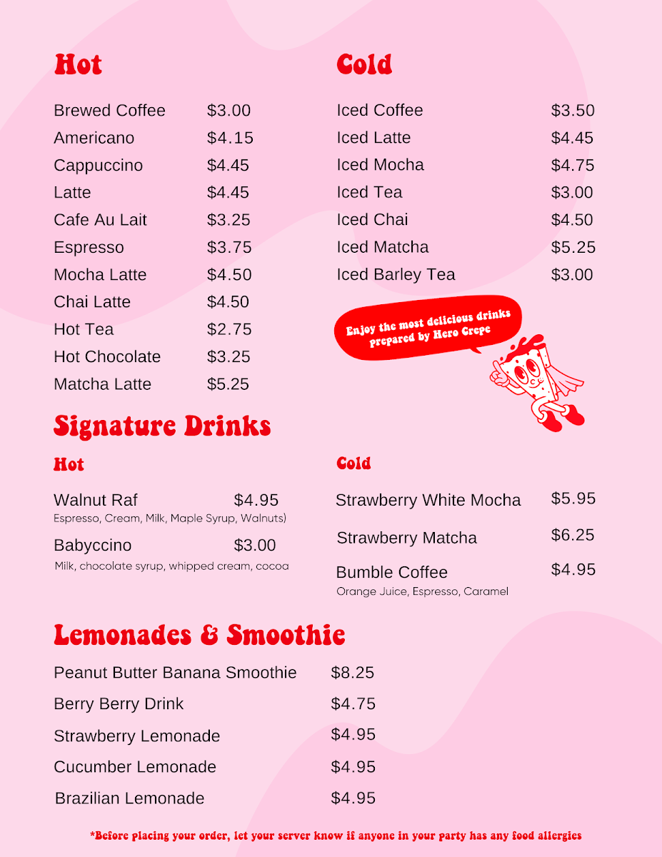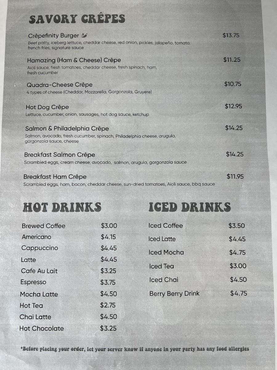 From a reviewer’s perspective, the menu at Crêpes 'n Capes offers a creative and diverse selection that balances both savory and sweet options along with a solid drink lineup. The savory section features satisfying choices like the Crêpefinity Burger, Hamazing (Ham & Cheese) Crêpe, Shawarma Crêpe, Quadra-Cheese Crêpe, and Tuna Crêpe, giving plenty of variety for those looking for a hearty meal. On the sweeter side, options such as the Fruity Crêpes, Creamy Strawberry Crêpe, Raspberry Crêpe, Mascarpone Salted Caramel, and Pear Gorgonzola provide a nice mix of classic and more unique flavor combinations. The drink menu complements the food well, offering hot beverages like Brewed Coffee, Americano, Cappuccino, Latte, and Cafe Au Lait, as well as cold options including Iced Coffee, Iced Latte, Iced Mocha, Iced Tea, and Iced Chai. Signature drinks such as Hot Walnut Raf, Babyccino, Cold Strawberry White Mocha, plus refreshing choices like the Peanut Butter Banana Smoothie, Berry Berry Drink, Strawberry Lemonade, Cucumber Lemonade, and Brazilian Lemonade add even more variety. To finish, the ICE CREAM ROLLS selection-Berry Vanilla, Oreo Caramel, and Banana Pudding-makes for a fun and satisfying dessert, rounding out a menu that feels both playful and well-thought-out.