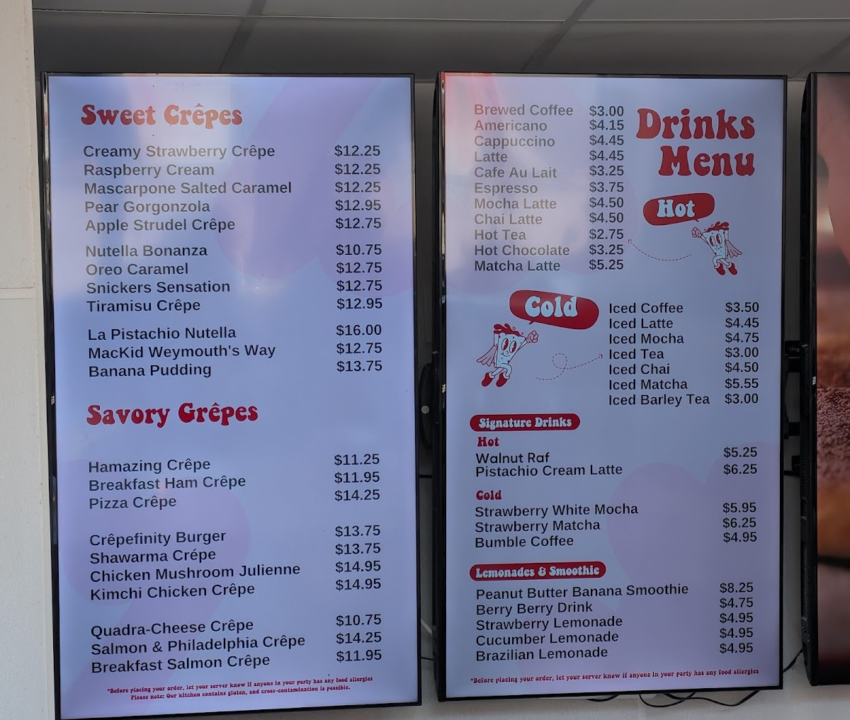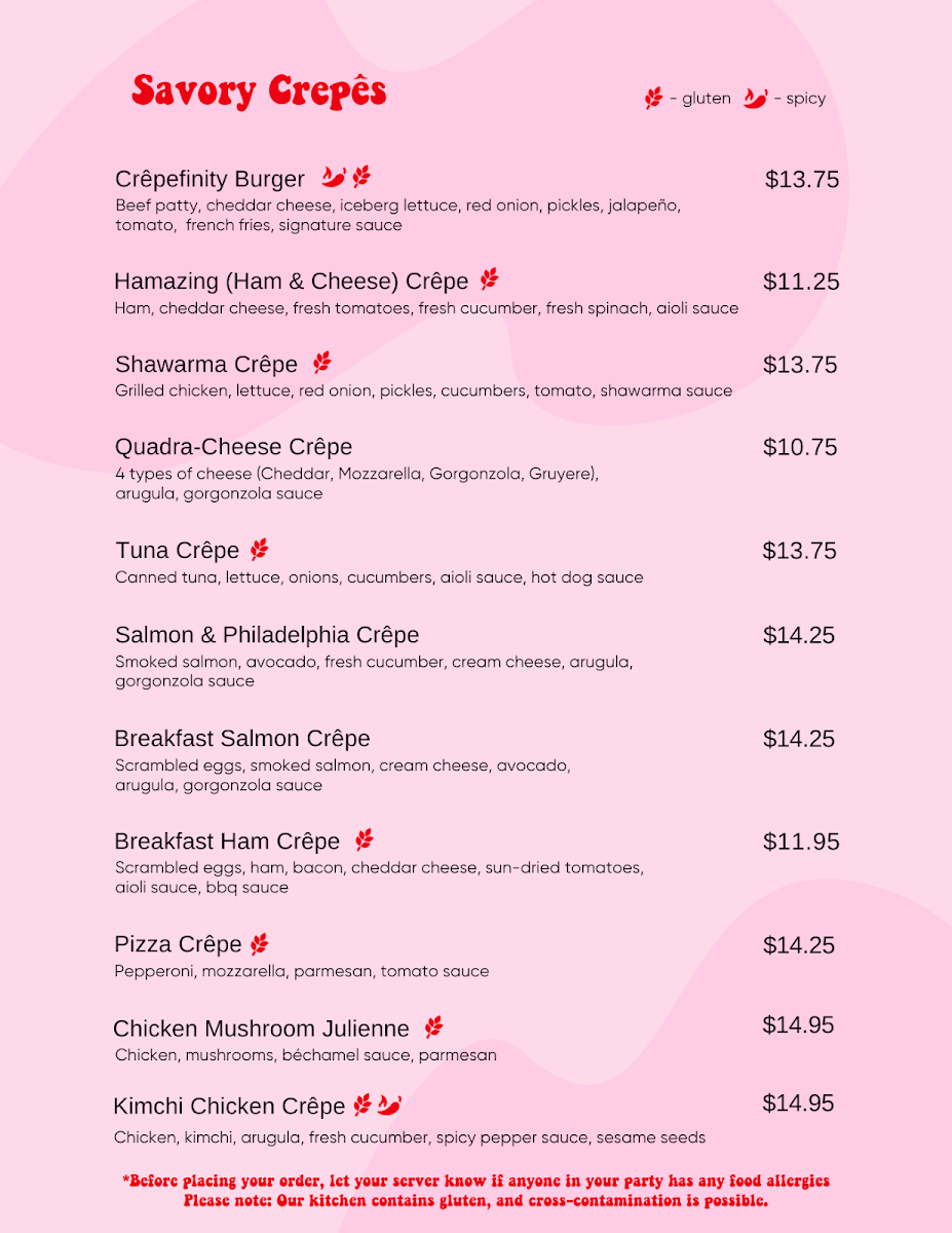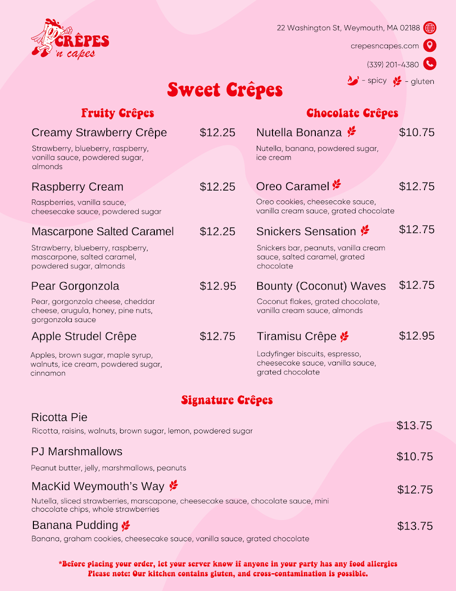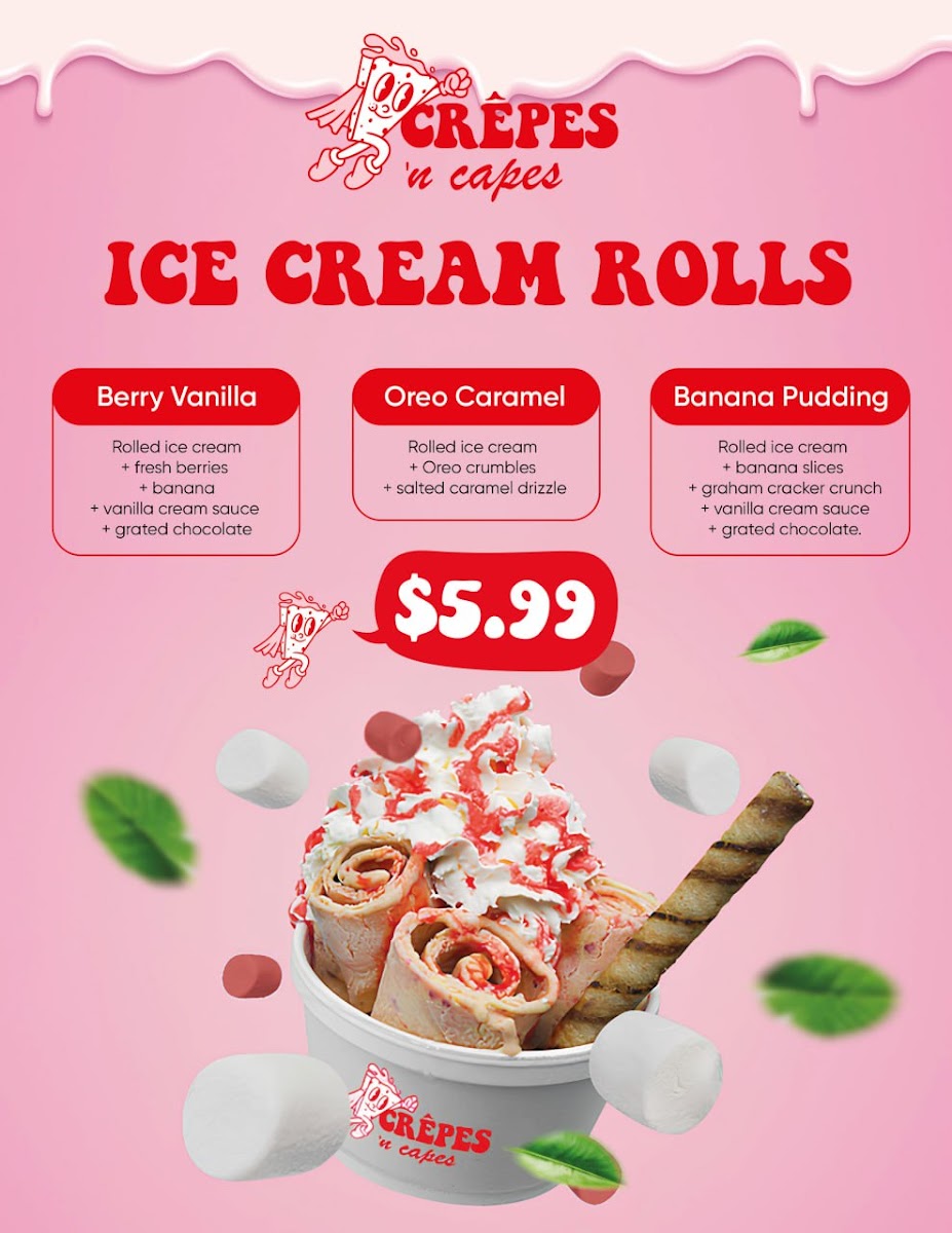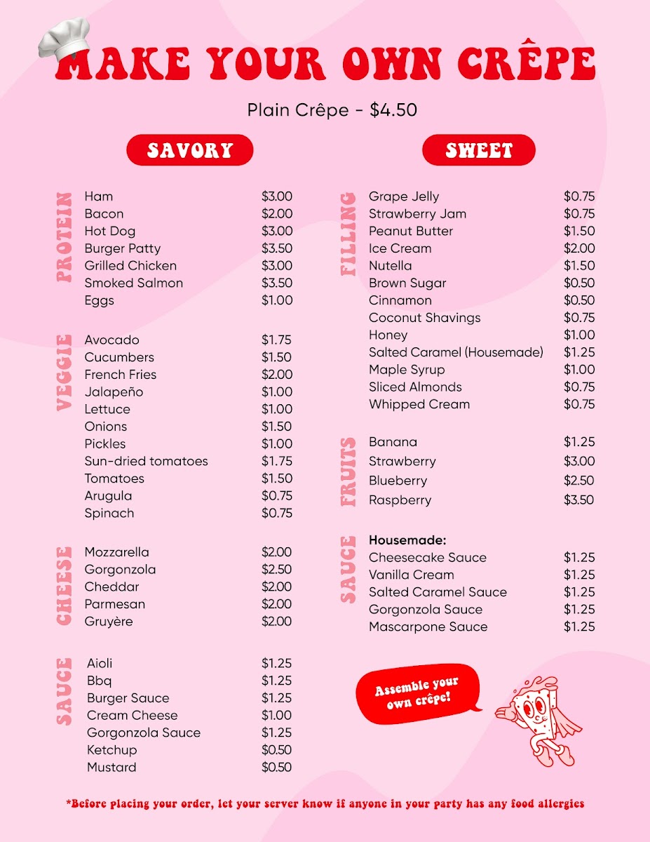 From a reviewer’s perspective, the menu at Crêpes 'n Capes offers a creative and diverse selection that balances both savory and sweet options along with a solid drink lineup. The savory section features satisfying choices like the Crêpefinity Burger, Hamazing (Ham & Cheese) Crêpe, Shawarma Crêpe, Quadra-Cheese Crêpe, and Tuna Crêpe, giving plenty of variety for those looking for a hearty meal. On the sweeter side, options such as the Fruity Crêpes, Creamy Strawberry Crêpe, Raspberry Crêpe, Mascarpone Salted Caramel, and Pear Gorgonzola provide a nice mix of classic and more unique flavor combinations. The drink menu complements the food well, offering hot beverages like Brewed Coffee, Americano, Cappuccino, Latte, and Cafe Au Lait, as well as cold options including Iced Coffee, Iced Latte, Iced Mocha, Iced Tea, and Iced Chai. Signature drinks such as Hot Walnut Raf, Babyccino, Cold Strawberry White Mocha, plus refreshing choices like the Peanut Butter Banana Smoothie, Berry Berry Drink, Strawberry Lemonade, Cucumber Lemonade, and Brazilian Lemonade add even more variety. To finish, the ICE CREAM ROLLS selection-Berry Vanilla, Oreo Caramel, and Banana Pudding-makes for a fun and satisfying dessert, rounding out a menu that feels both playful and well-thought-out.